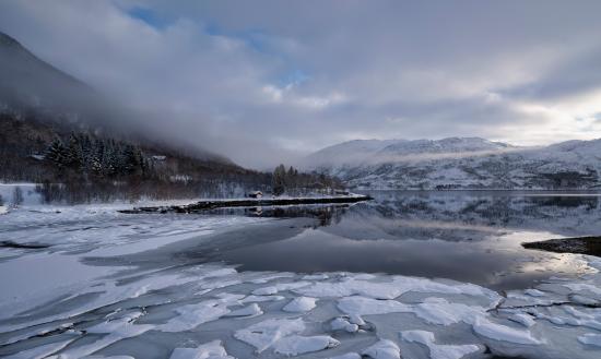 Wallpaper Ice-covered cold mountain lake in fog