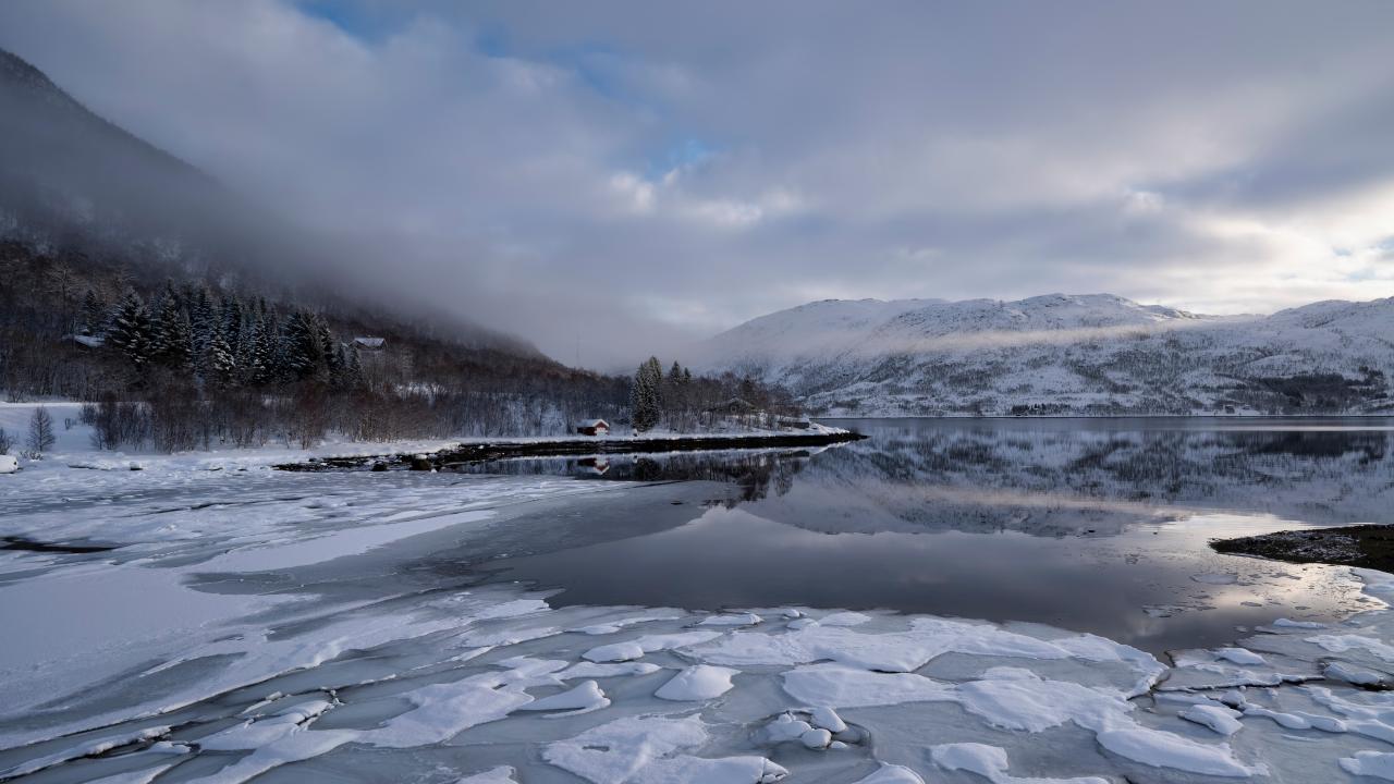 Wallpaper Ice-covered cold mountain lake in fog