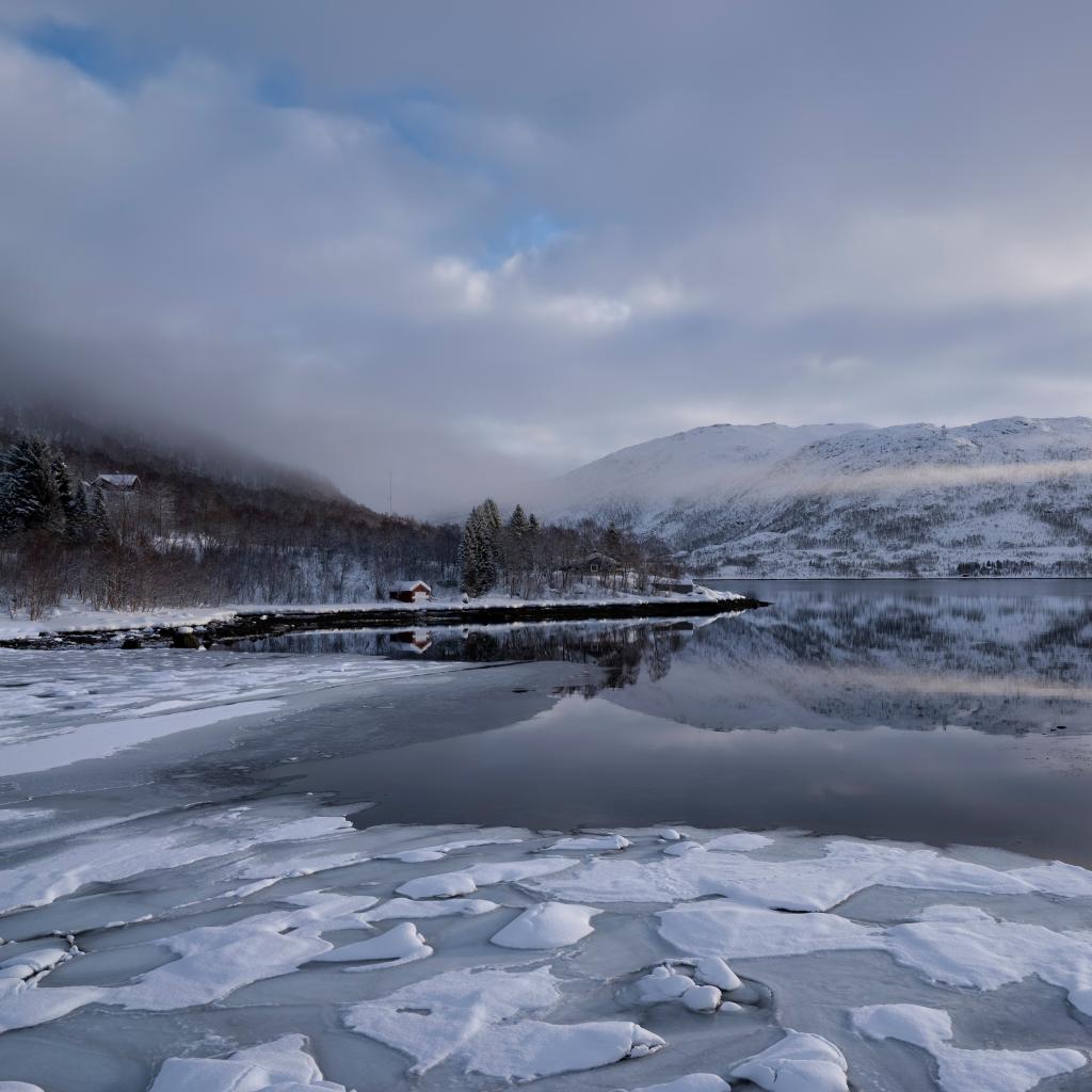 Wallpaper Ice-covered cold mountain lake in fog