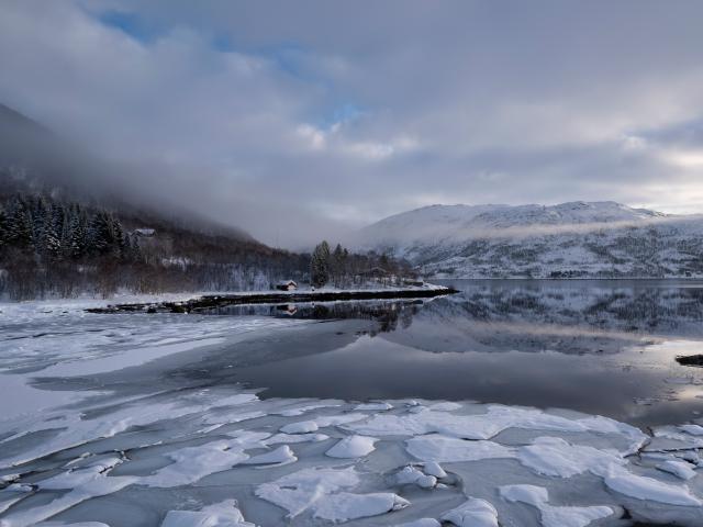 Wallpaper Ice-covered cold mountain lake in fog