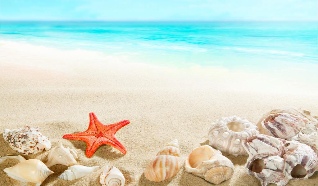 Wallpaper Starfish and seashells on the sand near the blue water of the sea