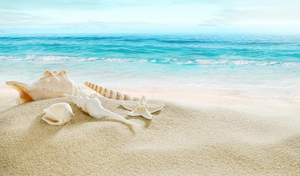 Wallpaper Shells on white sand on the coast near the sea