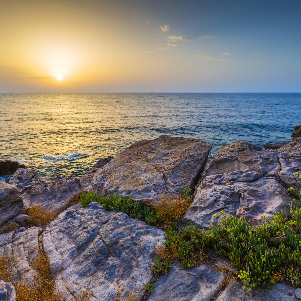 Wallpaper Stone rocks at sunset over the Mediterranean Sea, Greece