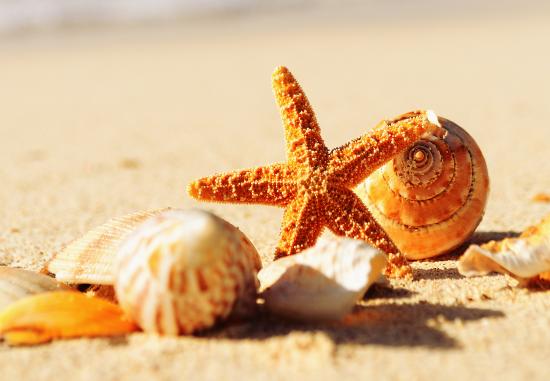 Wallpaper Shells and starfish on warm yellow sand in summer