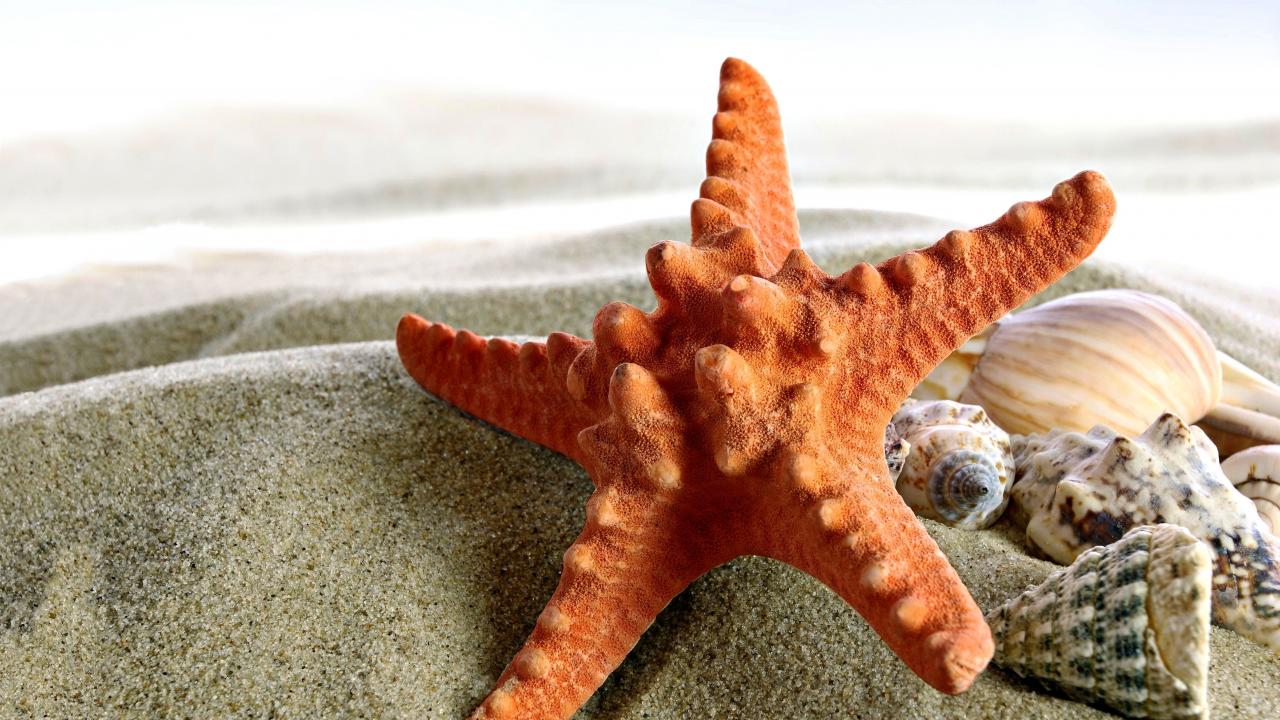 Wallpaper Starfish and seashells on sand closeup