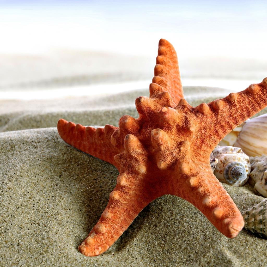 Wallpaper Starfish and seashells on sand closeup