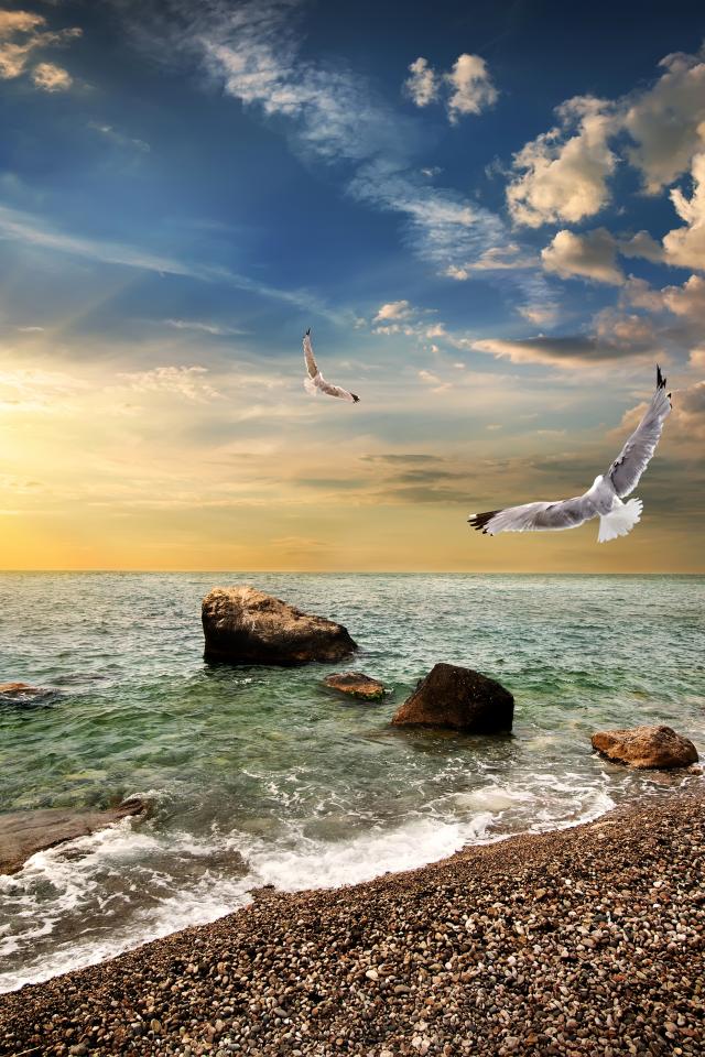 Wallpaper Seagulls fly over the seashore at sunset