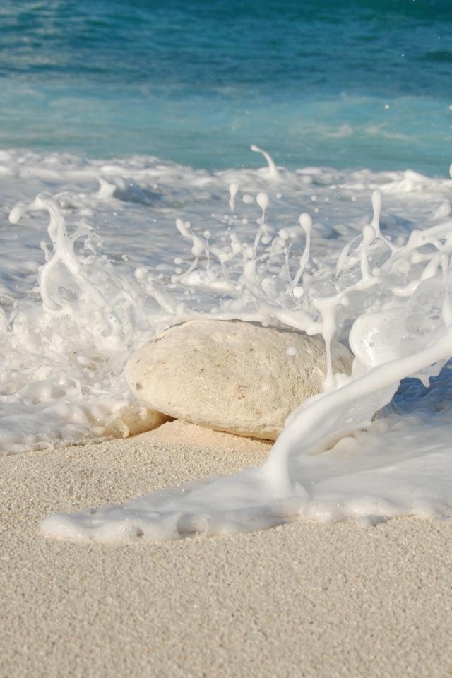 Wallpaper White sea waves beat against a stone on the yellow sand