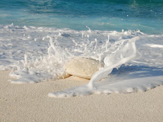 Wallpaper White sea waves beat against a stone on the yellow sand