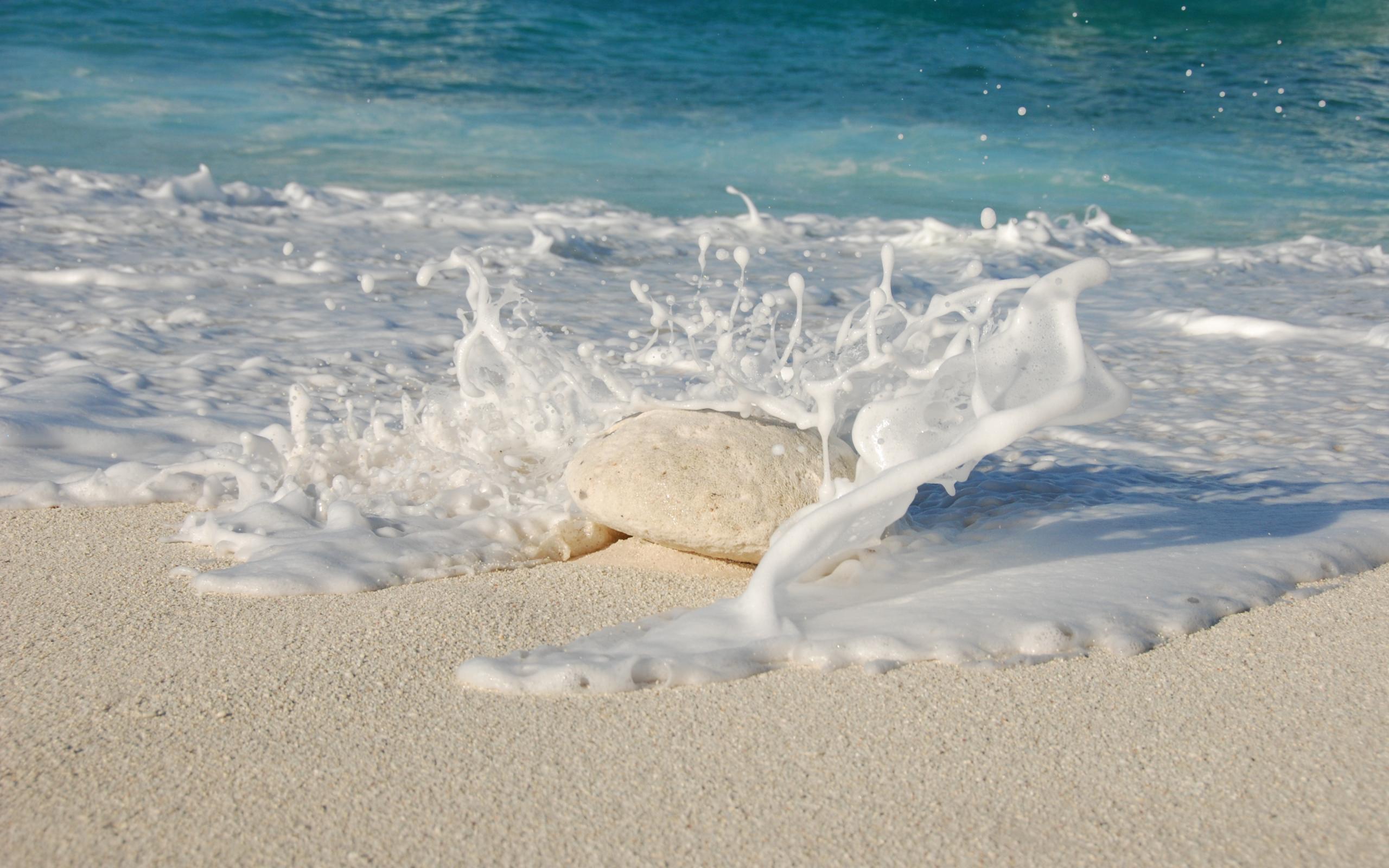 Wallpaper White sea waves beat against a stone on the yellow sand