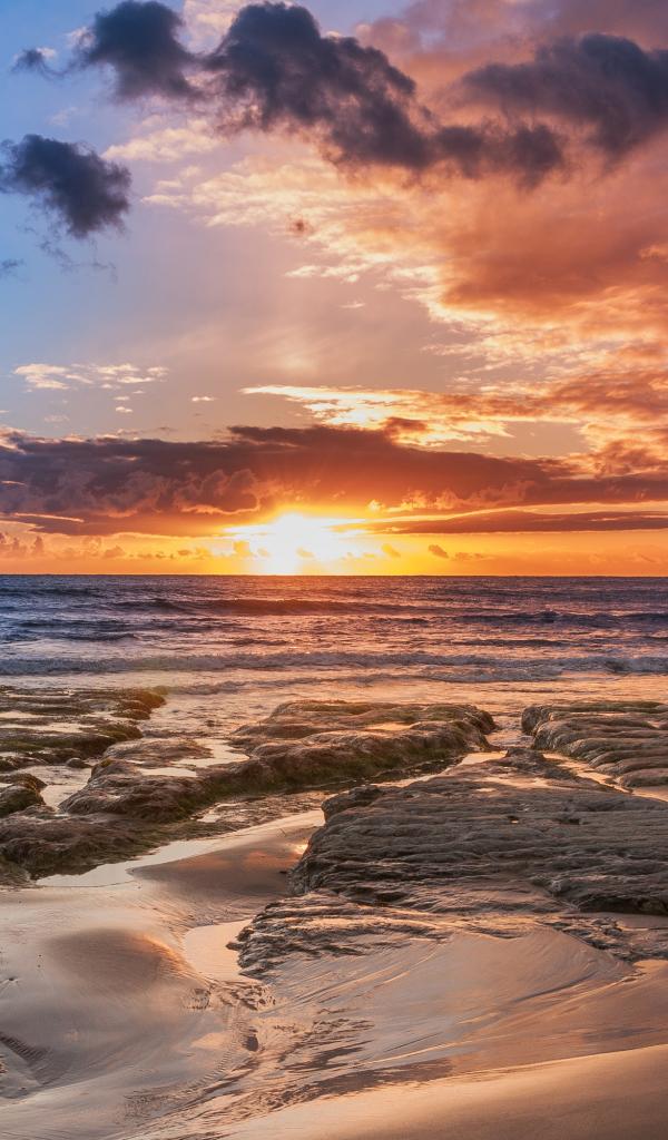 Wallpaper Wet sand and stones on the ocean at sunset