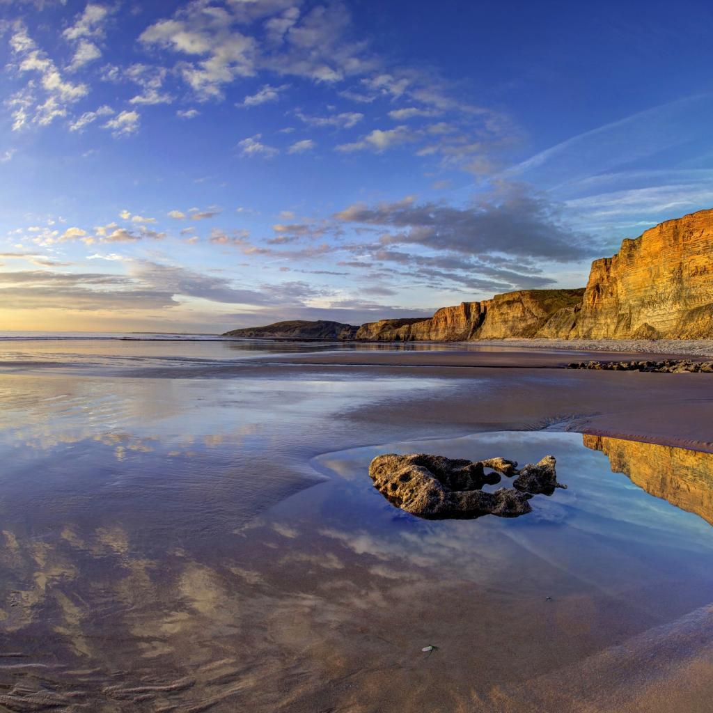 Wallpaper Wet seashore with rocks at sunset