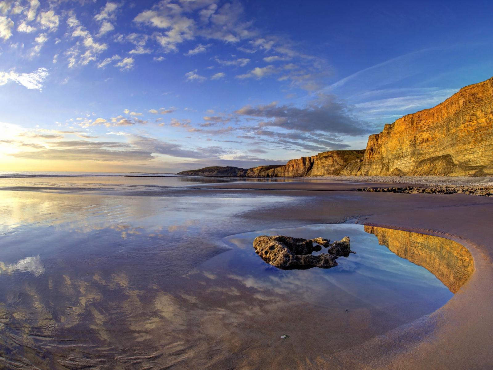 Wallpaper Wet seashore with rocks at sunset