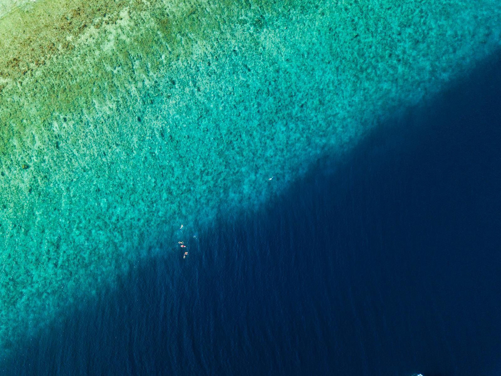 Wallpaper Mountain against a background of calm sea water under a blue sky