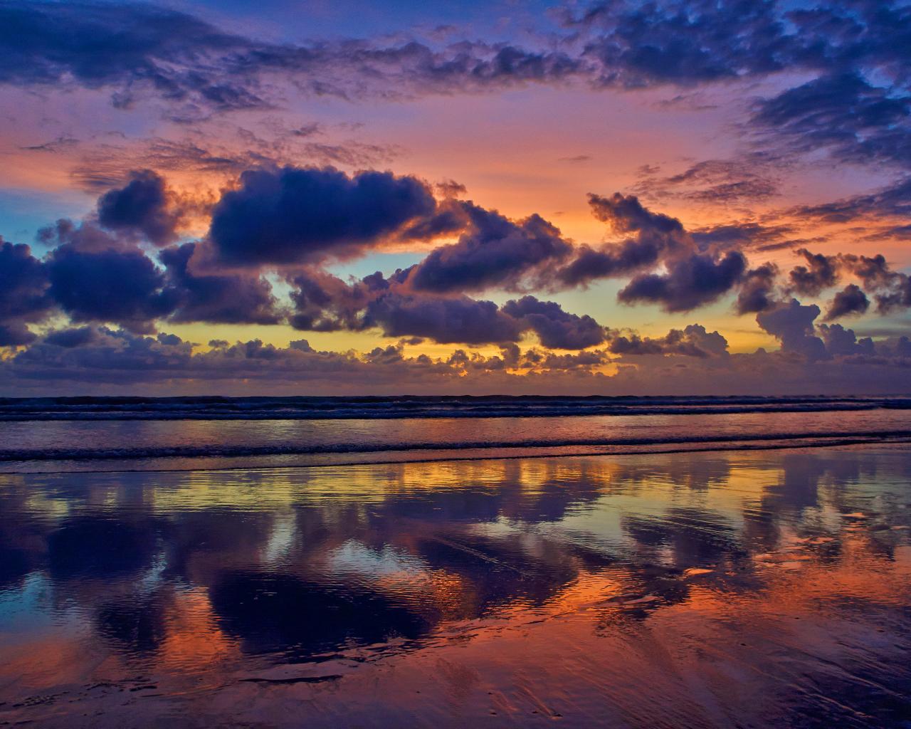Wallpaper Black clouds reflected in sea water at sunset.
