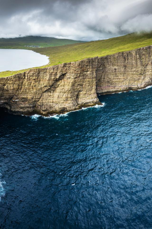 Wallpaper Ocean washed by a green cliff under a cloudy sky