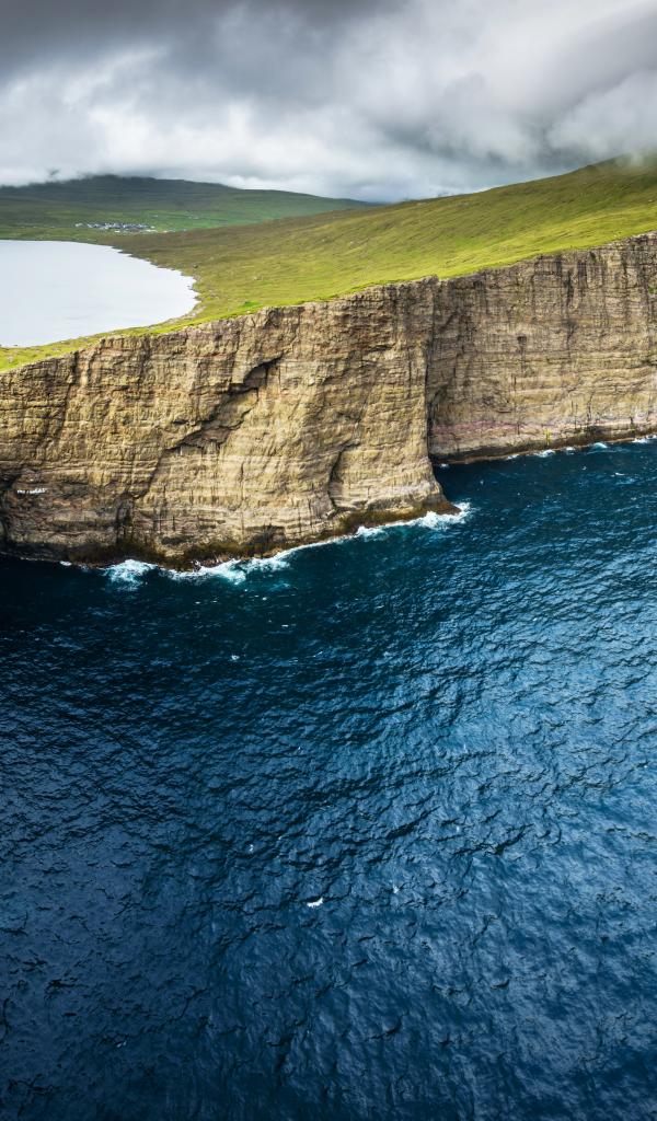 Wallpaper Ocean washed by a green cliff under a cloudy sky