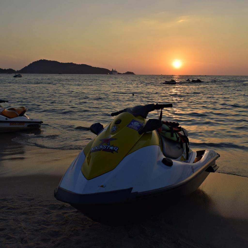 Wallpaper Water scooter on wet sand by the sea at sunset