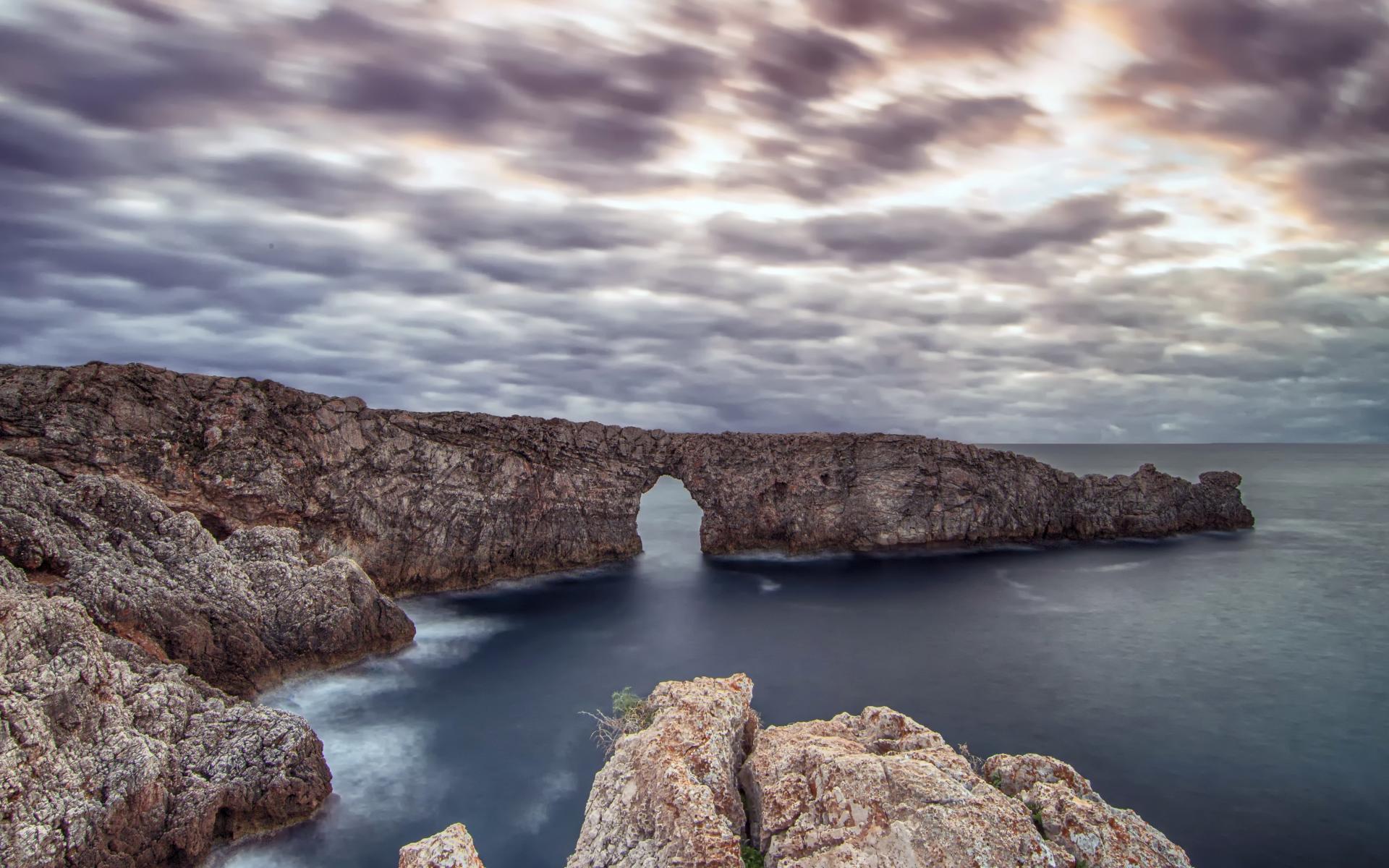 Wallpaper Arch in the rock in the sea under a cloudy sky