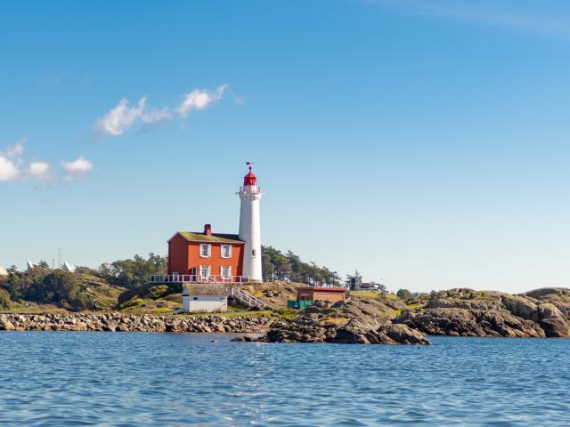 Wallpaper Lighthouse on the stone seashore under the blue sky