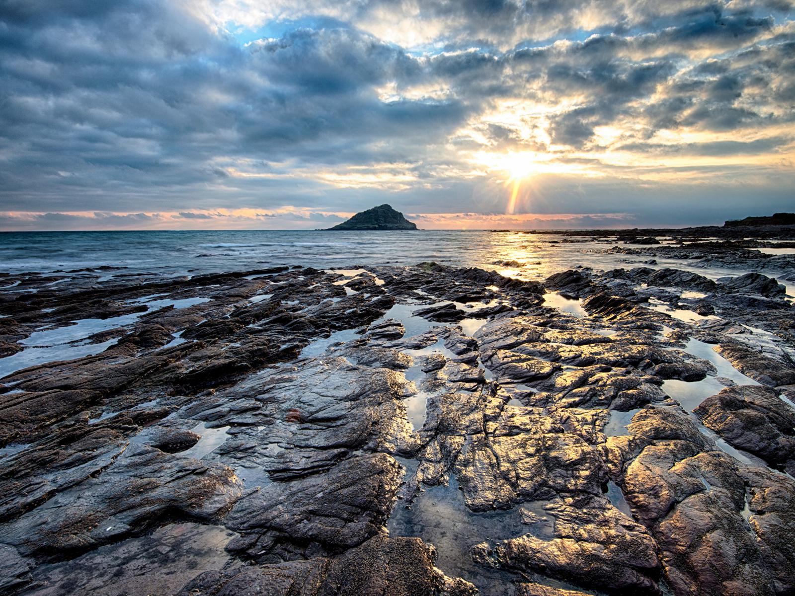 Wallpaper Rocks on the shore of the ocean in the sun at sunset