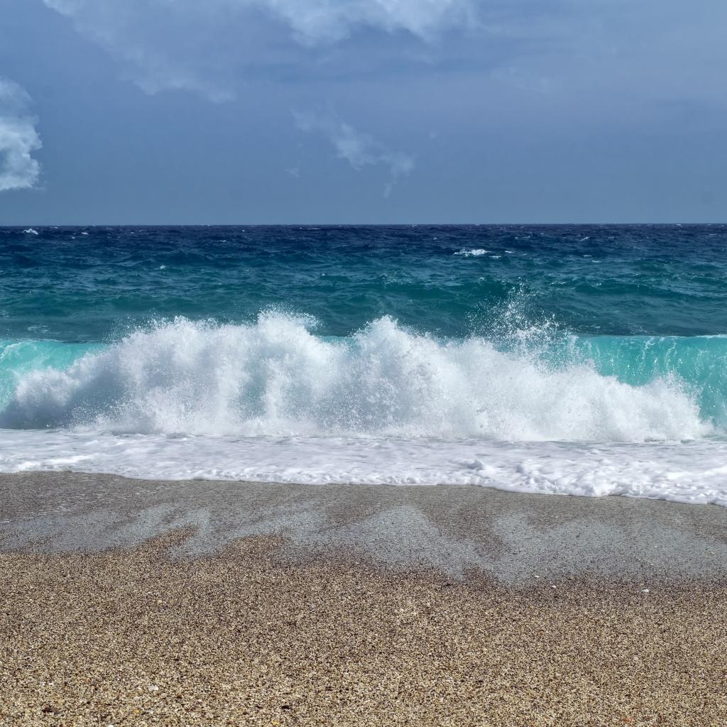 Wallpaper Waves of a blue ocean on yellow sand under a blue sky