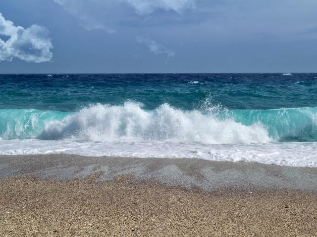 Wallpaper Waves of a blue ocean on yellow sand under a blue sky