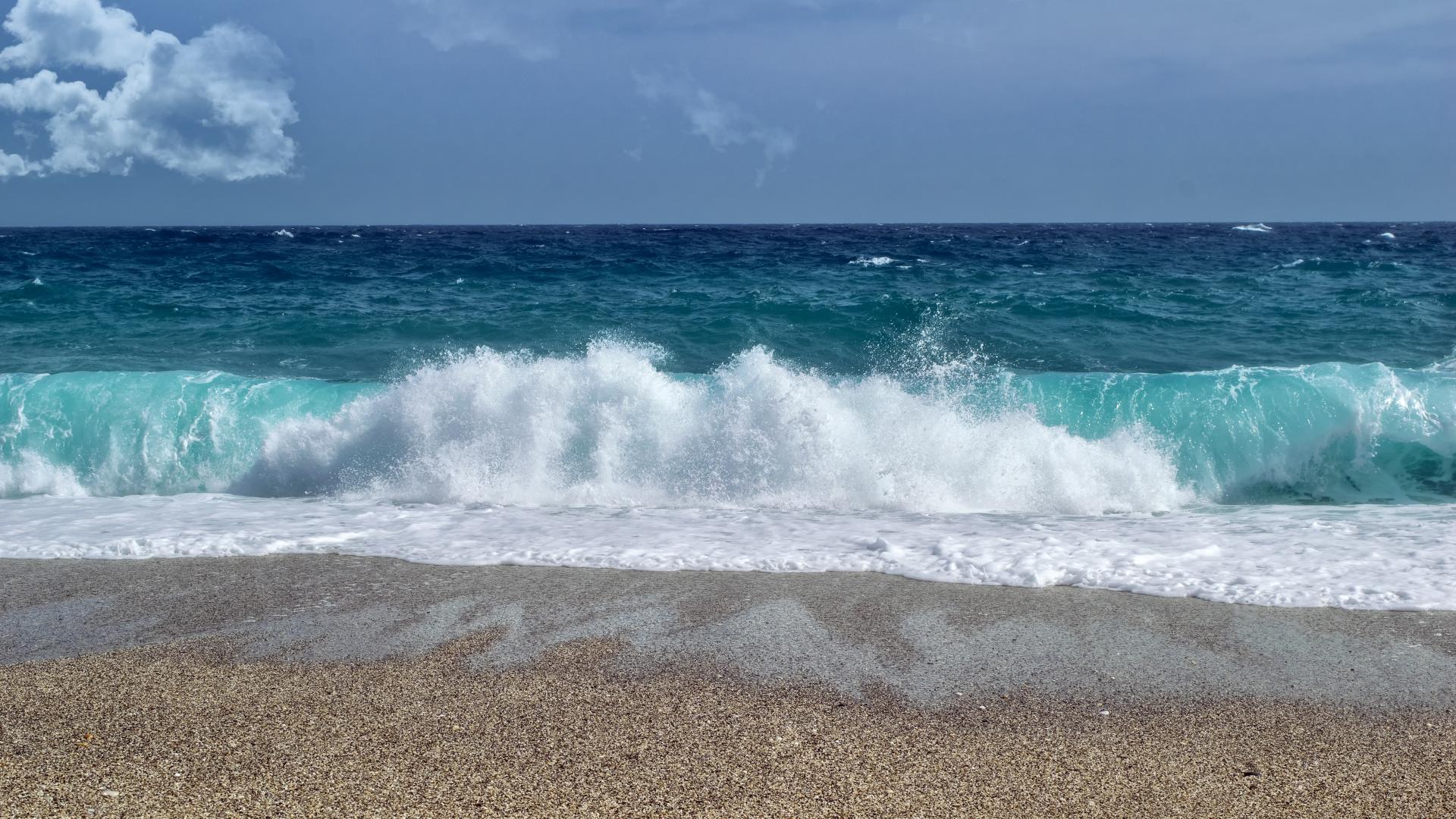 Wallpaper Waves of a blue ocean on yellow sand under a blue sky