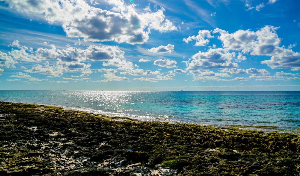 Wallpaper Bright blue sky with white clouds over the sea