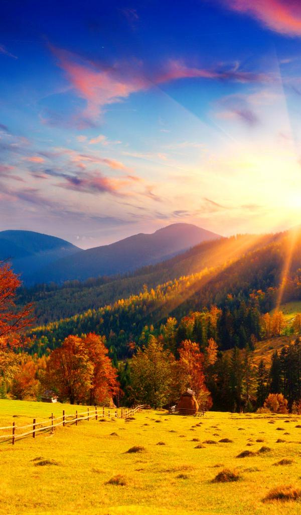 Wallpaper Autumn field with trees in the rays of a bright sun