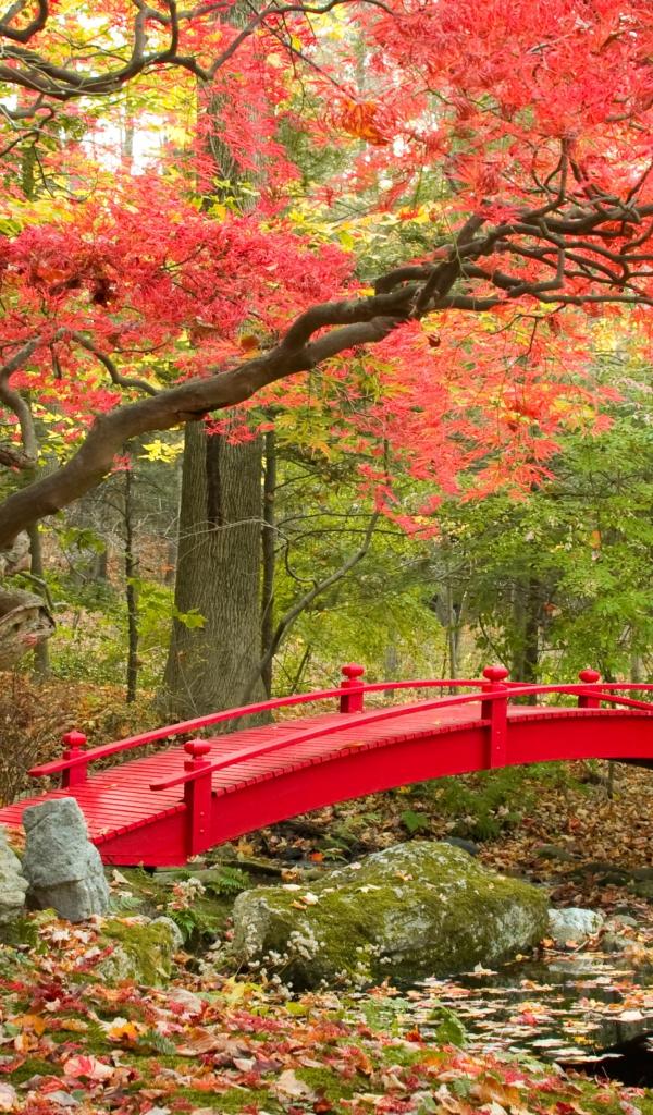 Wallpaper Red bridge in an autumn park near a red-covered tree