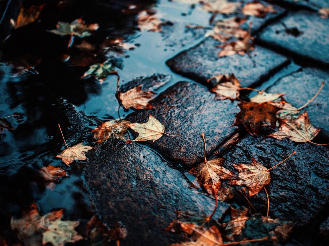 Wallpaper Yellow leaves lie on the wet sidewalk
