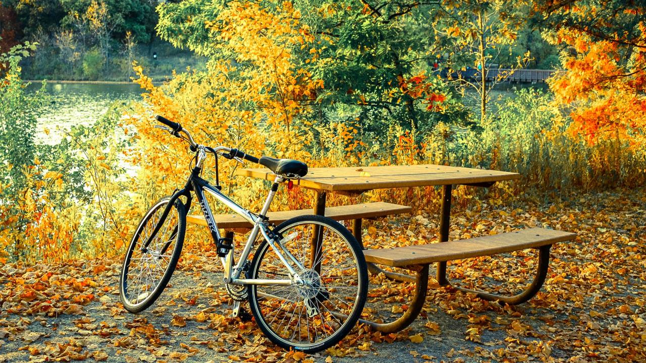 Wallpaper Bicycle stands at the bench in the autumn park