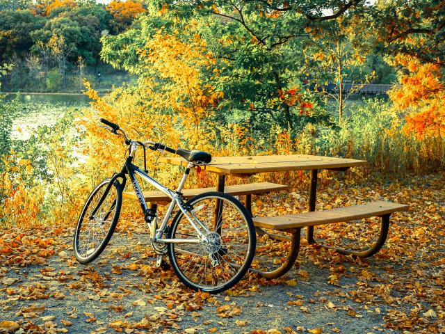 Wallpaper Bicycle stands at the bench in the autumn park