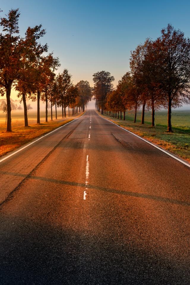Wallpaper Trees on a flat asphalt road in autumn