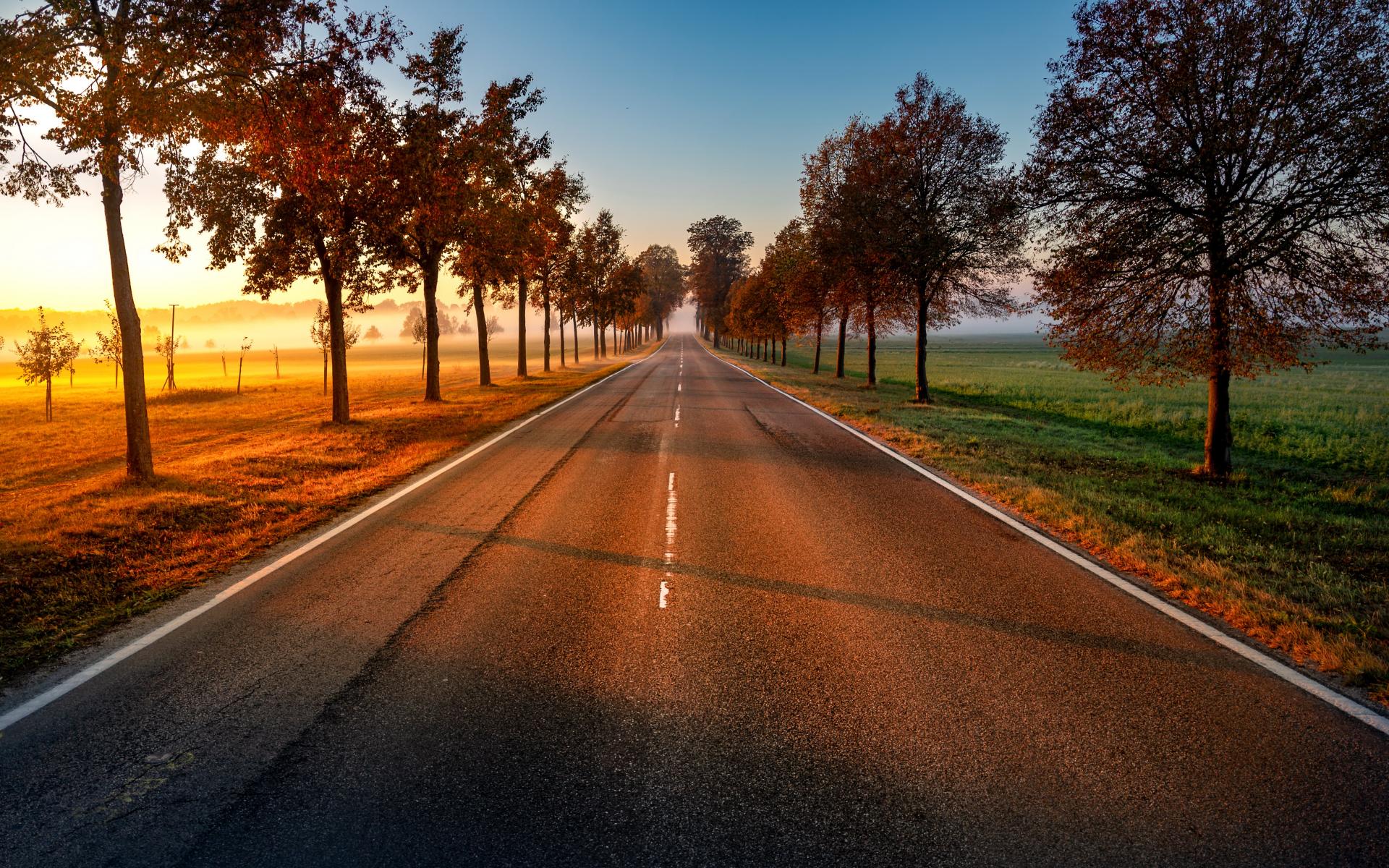 Wallpaper Trees on a flat asphalt road in autumn