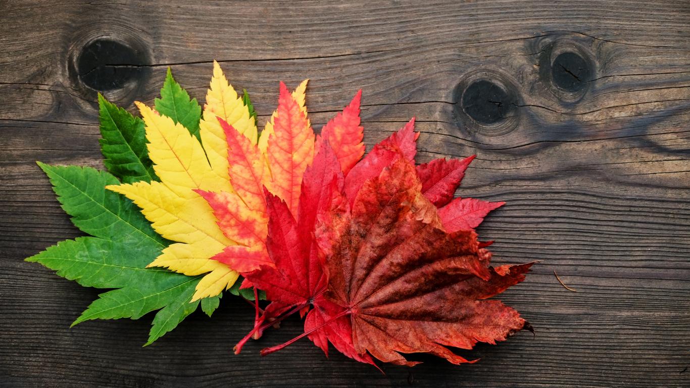 Wallpaper Colorful autumn leaves lie on a wooden table