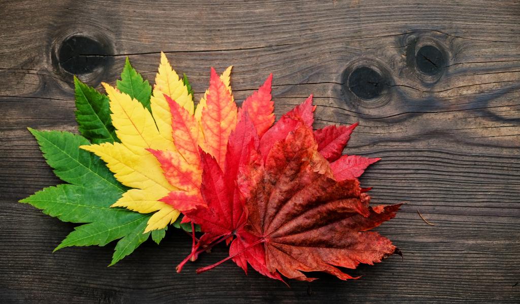 Wallpaper Colorful autumn leaves lie on a wooden table