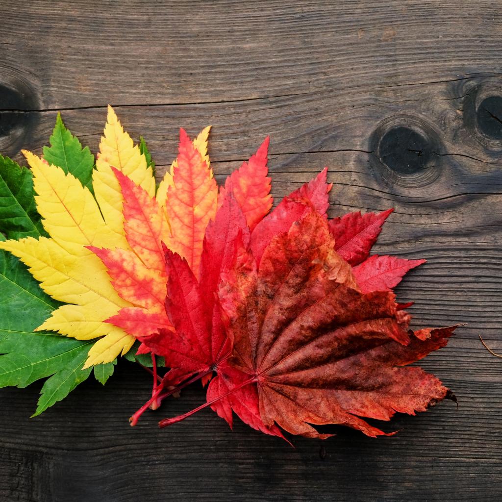 Wallpaper Colorful autumn leaves lie on a wooden table