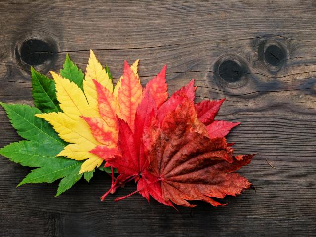 Wallpaper Colorful autumn leaves lie on a wooden table