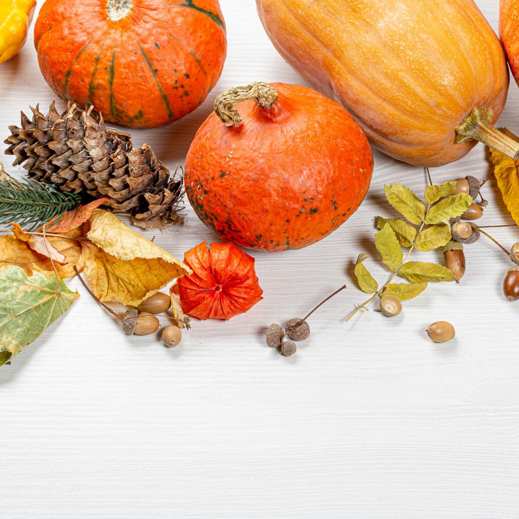 Wallpaper Pumpkins on a table with acorns in the fall