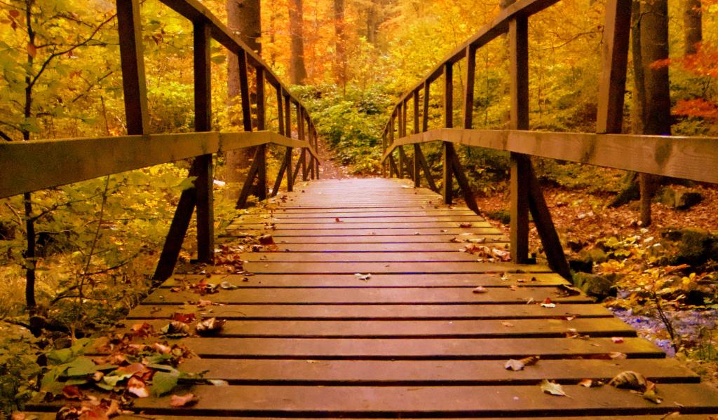 Wallpaper Red bridge in an autumn park near a red-covered tree