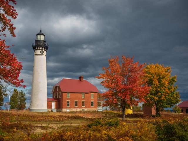 Wallpaper Lighthouse under a cloudy sky in autumn