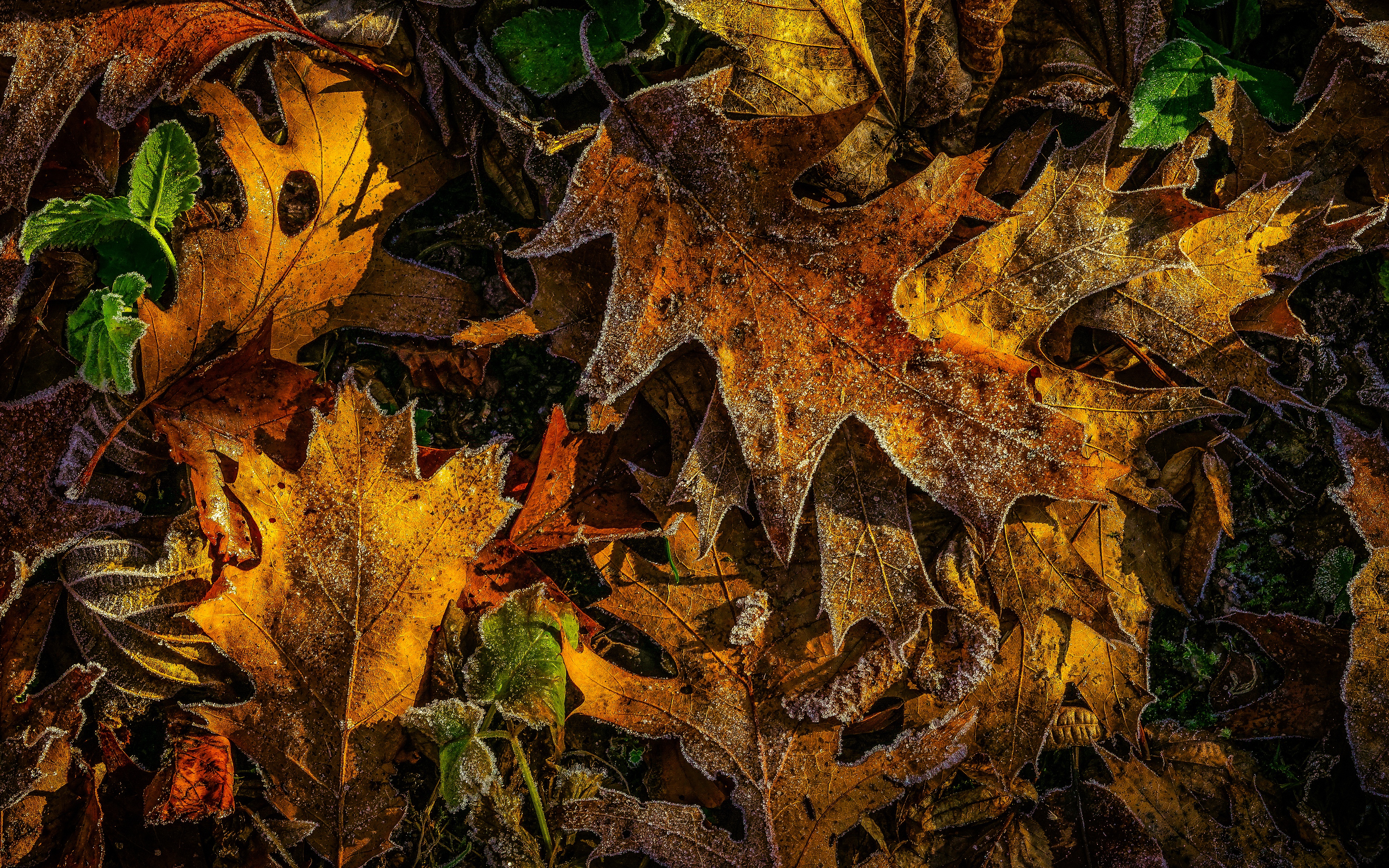 Wallpaper First frost on fallen yellow leaves