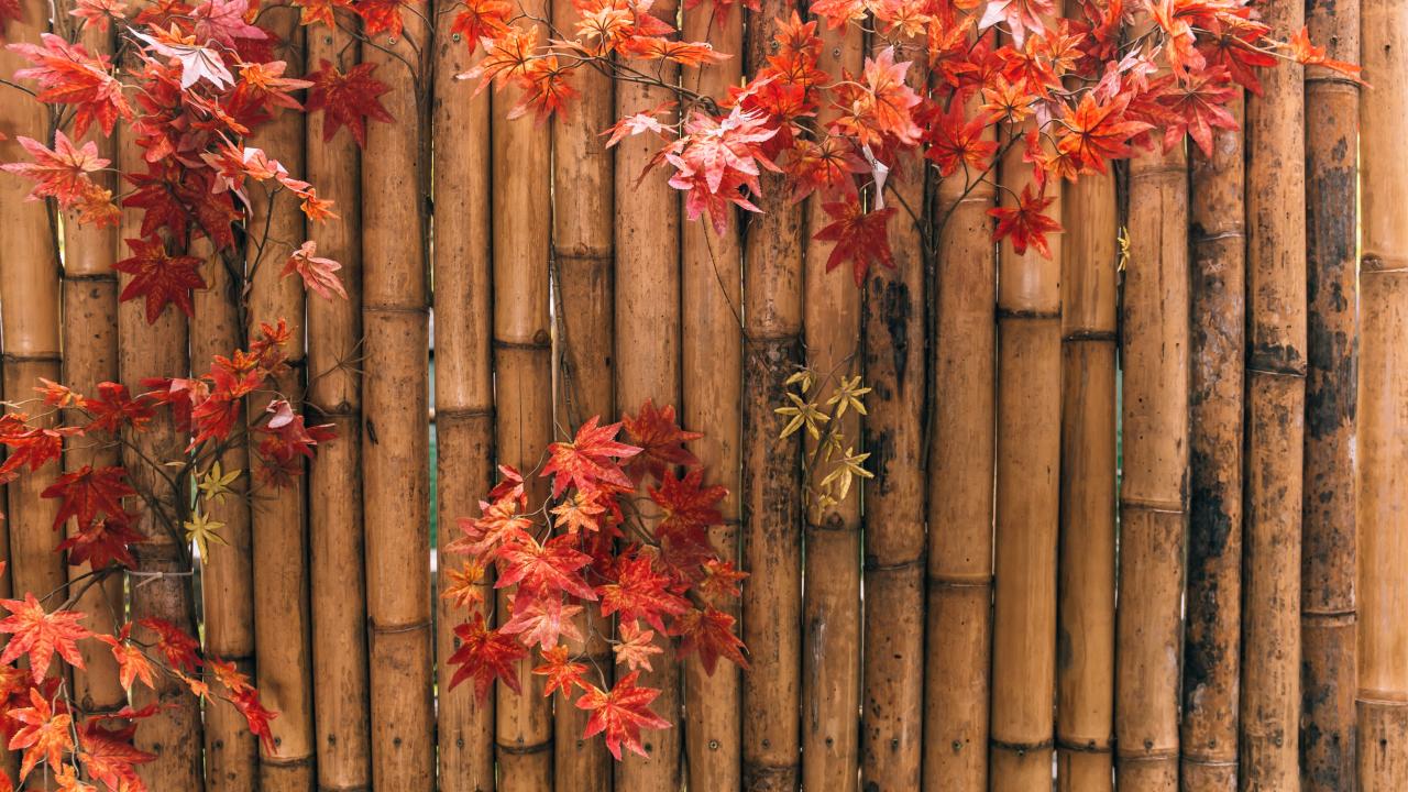 Wallpaper Yellow leaves on a bamboo fence in autumn