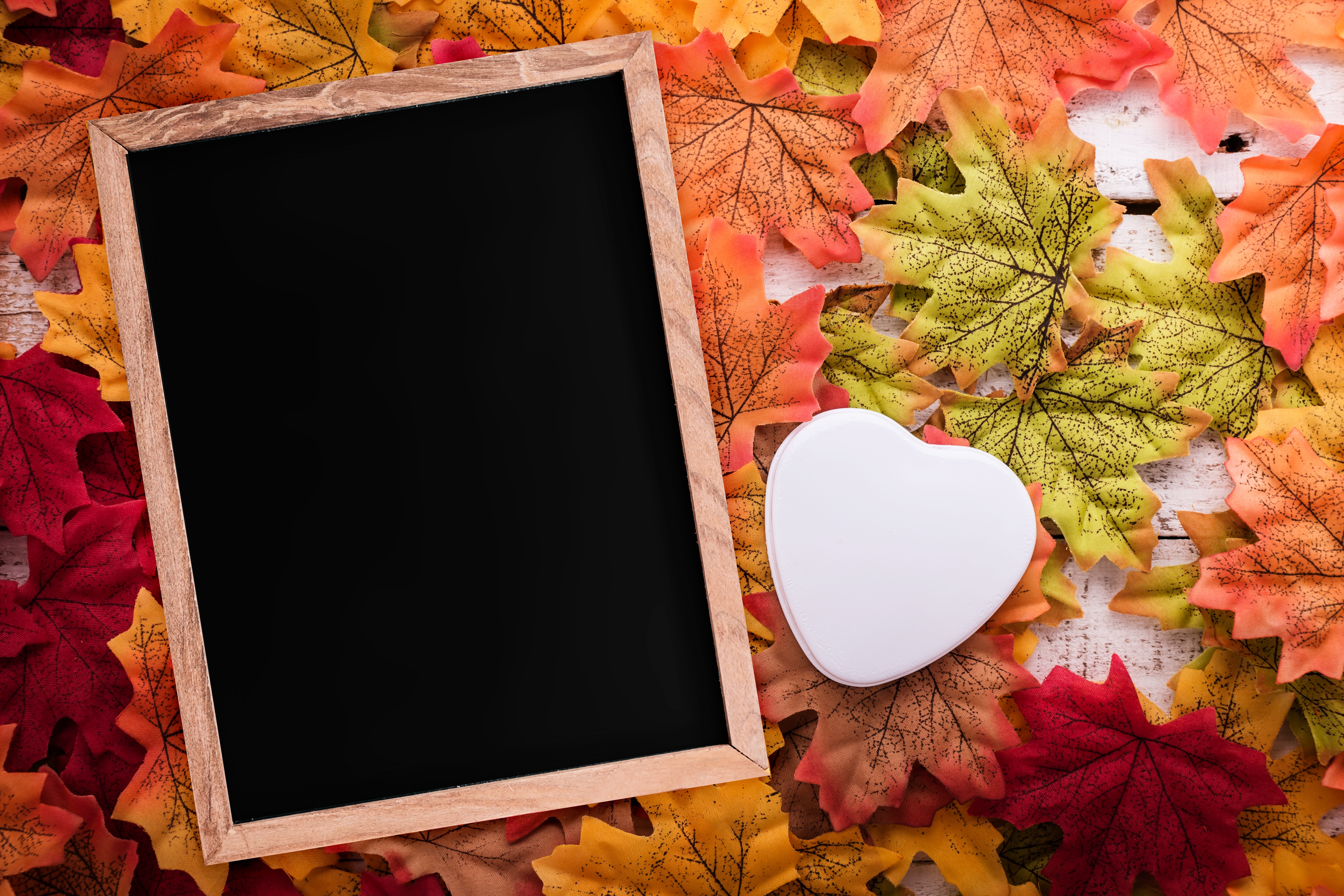 Wallpaper Photo frame on fallen leaves with white heart
