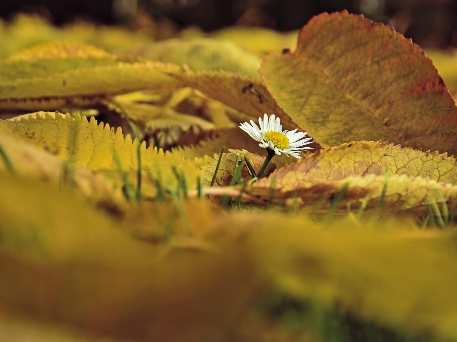 Wallpaper Small white chamomile with fallen leaves