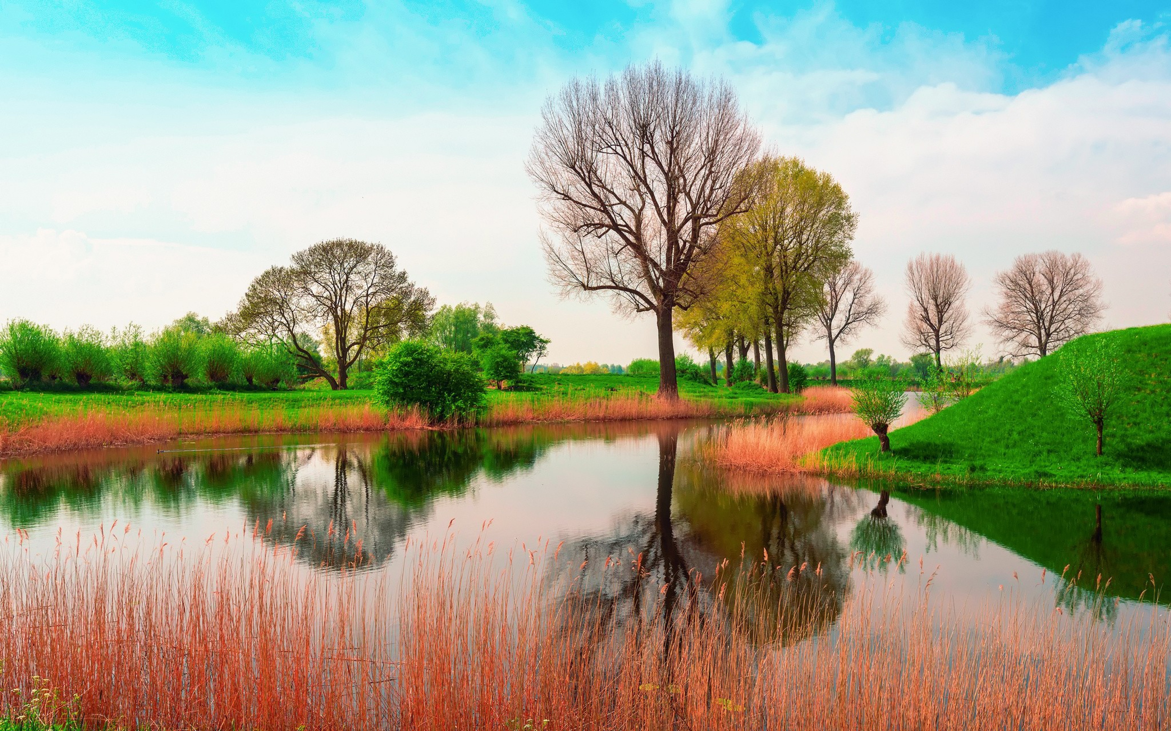 Wallpaper Green spring grass near the pond