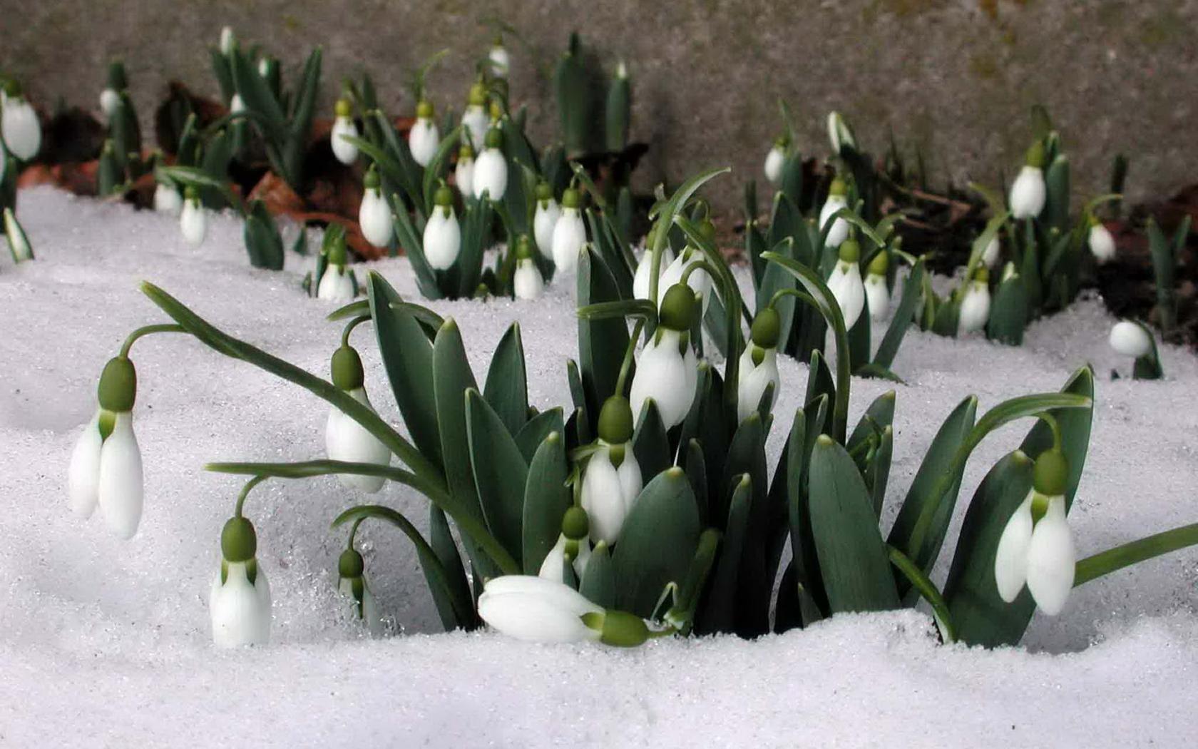 Wallpaper Primrose flowers under the melting snow of spring