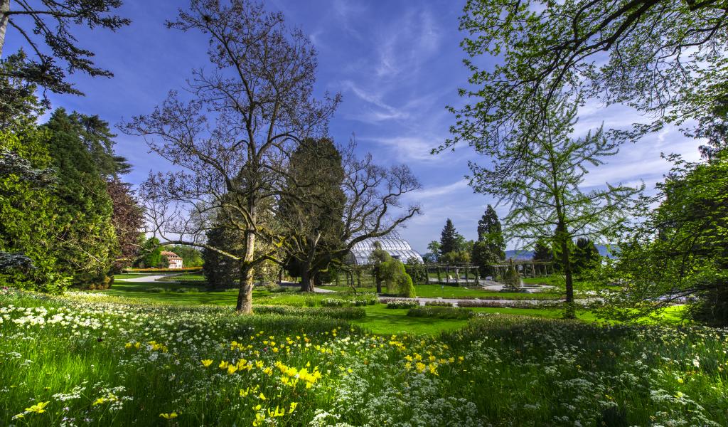 Wallpaper First spring flowers in green grass under blue sky